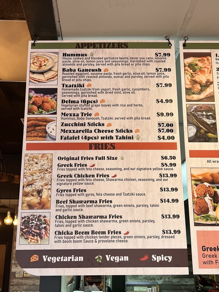 “ Ambiance: Not too much ambiance in this business. It is clean and the staff are friendly. Large tables are great for larger groups. Service: They take your no order at the counter and will bring it to your table if dining onsite. Very friendly and will be happy to help you choose a dish suited for your taste. Food: I have tried both the Chicken and Steak Sharma Bowl and the Greek Fries. All were yummy and will be my new favorite. Give this place a try; they have many yummy dishes. See you there! ”
